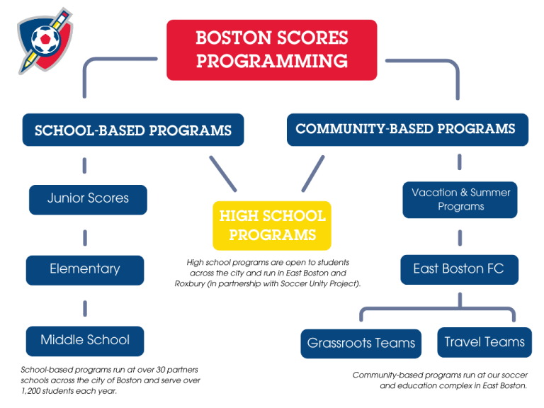 Today, Boston SCORES has high-school teams based in East Boston and Roxbury with year-round programming. Students playing out of East Boston play under East Boston FC, and students playing out of Roxbury play under South End Scores